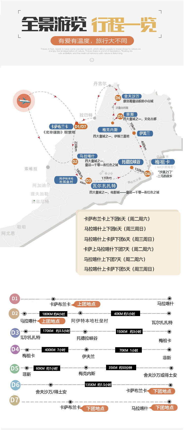 共6个上下车地点: 卡萨布兰卡-马拉喀什-阿伊特本哈杜筑垒村-瓦尔扎扎特-托德拉峡谷-梅祖卡-伊芙兰-菲斯-梅克内斯-舍夫沙万(或得土安)-卡萨布兰卡-马拉喀什